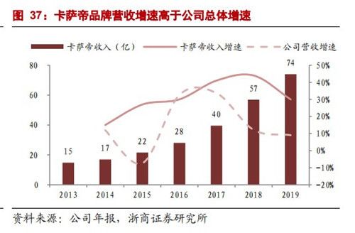2014年-2019年,卡萨帝收入从17亿元增至74亿元,复合增速高达34.23%,占公司内销总营收比例从2.19%扩大至6.97%。安信证券估算2019年卡萨帝在海尔智家内销税前营业利润中占比在20%-30%之间。