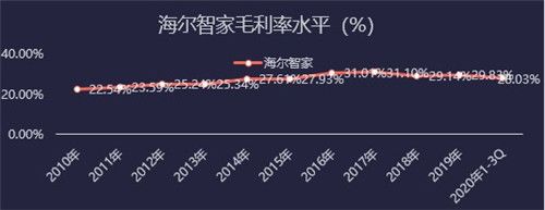 2010年-2019年,卡萨帝收入规模的高涨,带动了海尔智家毛利率由22.54%拔高到29.83%。2020年前三季度,该指标为28.03%,仅比上年同期微降0.78%,高出美的2.74个百分点,高出格力4.66个百分点。
