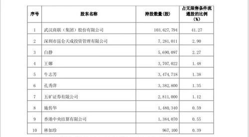 注:1、以上股东的持股数量为合并普通账户和融资融券信用账户后总的持股数量。 2、上述“前十名无限售条件股东”中包含了武汉商联(集团)股份有限公司“承诺锁定股份”: