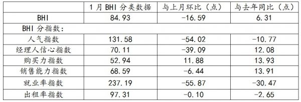 BHI为全国建材家居景气指数的简称,是由商务部流通业发展司、中国建筑材料流通协会共同发布的一个建材家居终端卖场的景气度指数。它是从全国各指定的集中采集点采集了50000家建材家居商户(铺)的相关数据编制而成。BHI反映了建材家居装饰装修材料的景气度及市场走向,同时与国家房地产开发景气指数对比,还能反映出房地产刚性需求的强弱。由商务部流通业发展司、中国建筑材料流通协会共同发布的全国建材家居景气指数BHI 1月份全国建材家居景气指数(BHI)为84.93,环比下降16.59点,同比上涨6.31点。全国规模以上建材家居卖场1月销售额为755.5亿元,环比下降8.59%,同比上涨25.45%。