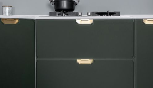 人人都想着琴棋书画诗酒花,可谁也逃不过柴米油盐酱醋茶。“青晨”是具有柏厨品牌调性的轻中式风格产品,轻厨轻食轻生活的设计理念。“青晨”为烟火气极重的厨房添加了一丝清新淡雅,全新原创仿铜八角拉手,设计灵感源于苏州园林八角窗,造型获国家外观专利保护,透过八角窗即可窥视园林一隅美景,拉手是连通消费者与橱柜的“窗”,打开橱柜,开窗纳八方之福,开启美食人生;拉手通过10级盐雾测试,持久保持光泽且耐腐蚀,内空深度大,拉取舒适省力。