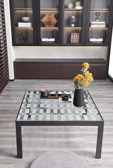 DNA玻璃茶几与西方形制的外表下,巧思东方的内涵,设计萃取柏厨品牌元素,构成独特的品牌图腾,独具匠心的材质运用轻度、中度玉砂玻璃及超白透明玻璃相结合,无指纹处理,通透明澈;底部为加厚不锈钢底座,抗氧化,美观又稳重,以茶会友,风云际会。与之遥相呼应的DNA电视柜柜门运用艺术烤漆玻璃贴片工艺;纹样萃取播出“柏”字的造型元素,蓝白相映成趣,营造别具一格的东方意蕴。