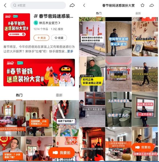市场消费主体的年轻化愈发明显,而一直精准定位年轻消费群体的林氏木业最近和快手理想家联合发起#春节爸妈迷惑装扮大赏#的话题活动。利用自身沉淀多年的大数据,在1300万用户的消费数据中,分析消费者的购物行为、触媒习惯与消费偏好,将数字化营销搬到台前。该活动凭借花式趣味视频获得高热度传播,吸引大量用户参加互动讨论,成功出圈吸粉,打响了品牌数字化营销战役的新年第一枪,精准触达和Z时代年轻人快速沟通的捷径。活动上线仅一周总曝光量就超过1.8亿,凭借犀利的话题,逗趣的内容激发了上千个UGC原创作品投稿,深度激活了快手平台的年轻垂类用户同时有效触达林氏木业核心目标消费群体。通过梳理清晰精准的粉丝用户画像,配合信息流投放的精准赋能,进一步助推了品牌在春节档的传播热度,流量储备与二次扩张。