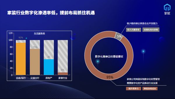 l 强大的数字化能力,利用移动互联、云计算和大数据技术研发家装业务全流程管理软件——掌赋APP,为家装公司打造标准的施工管理流程,提升自主营销获客能力,提高转化与交付效率,降低企业管理成本,实现数据资产沉淀;