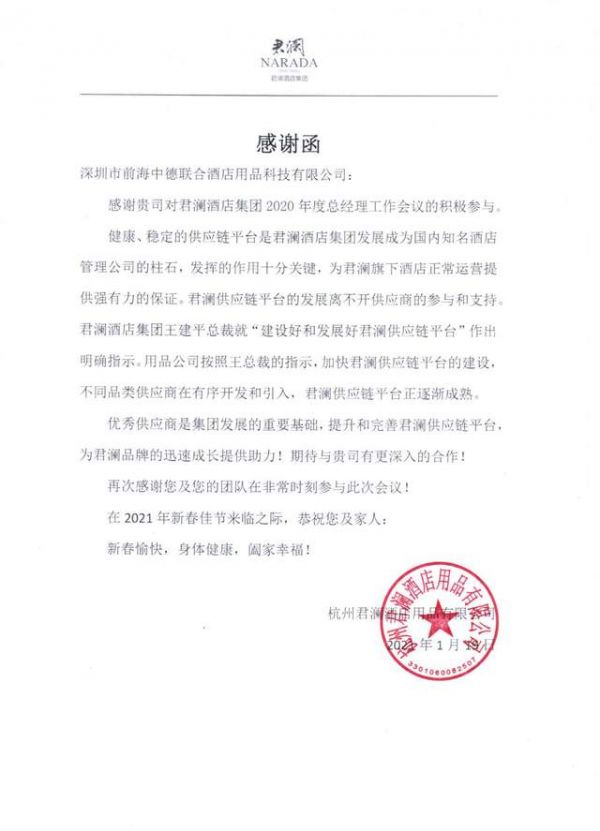 本次会议虽然是在特殊时期举行,但中德联合公司仍不遗余力、积极参与,从客房洗护产品专供到现场展台展示,其人员的专业服务水平、产品的优良品质,均获得了与会人员的一致好评。会后,中德联合公司得到了君澜集团的感谢函件。