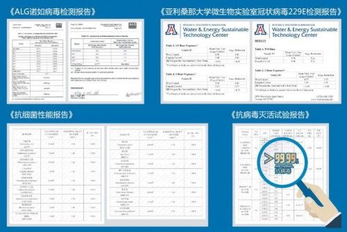 经过国际权威微生物检测机构ALG(持证可为EPA和FDA进行良好实验室标准的测试)的检测,2小时有效杀灭>99.987%的诺如病毒;经过University of Arizona(亚利桑那大学)的微生物实验室的检测,2小时有效杀灭>99.9%的冠状病毒(SARS-CoV-2 ),2小时有效杀灭>99.996%的冠状病毒229E。
