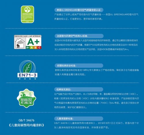 儿童漆国家标准,即GB/T 34676《儿童房装饰用内墙涂料》,于2018年5月1日正式实行,是国内首个针对儿童涂料制定和发布的国家标准,环保要求更严苛。