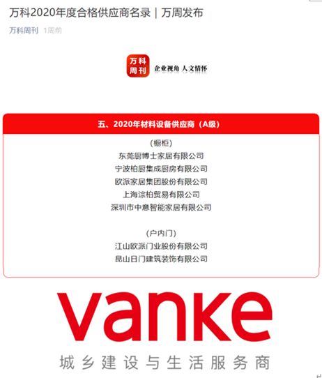 被更多人选择 柏厨家居荣膺万科地产2020年度合格供应商名录