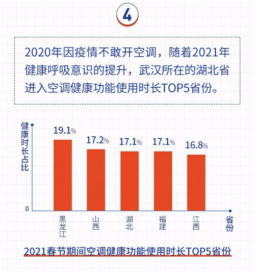 春节假期,开空调必选“健康”成为共识。2021年春节,健康功能使用频率TOP5省份分别是黑龙江、山西、湖北、福建、江西。黑龙江和湖北对健康空调的关注都与当地人们的健康意识普遍提升和健康空调产品的普及密切相关。