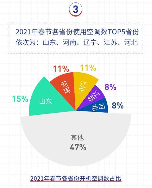 春节假期,最爱开空调的TOP5省份是:山东、河南、辽宁、江苏、河北,TOP5省份开机空调数总占比达53%。其中,开空调最多的是山东,占比达15%,这主要是因为当地人口基数大,空调用户基数也比较高。