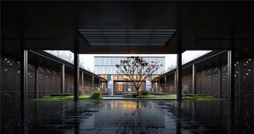 三进两院:整个空间前后三进,层层递进,极具中式空间的含蓄与神秘之感。前后入口皆为亭,中部接待区称为堂,亭堂连接之处谓之廊,三者围合起来便是“院”了。 每一境都自成一派,又整体归一,既开放又包容,显然将空间探寻的主动权让渡于步入者:或为碧绿高枝吸引,或为镜面水光驻足,或欲沉入深邃,便择幽静长廊小步徘徊,独处慎思。更多人落脚至前亭,便随了悠长景深带来的泛泛微光的指引,穿亭过院沐天光,入到云上书院。
