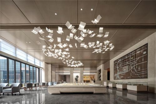 空间整体以透亮肌理的原木色大理石砖奠定空间基调,沙盘区则以更大体量的表达作为场景的焦点。高低错落的灯饰是另一种形式的诗意叙事。像翻动的书页渗出智者的闪光,也像梦想的翅膀,致敬每一位对生活充满热爱的人,将希望源源不断地向更广阔的世代涌动。