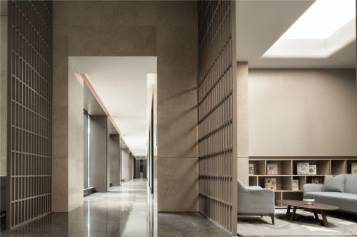 既敞开了迎接,便不主张设置过多屏障,仅以中式格栅稍稍隔挡,隐秘而不闭塞。两旁长廊作为承接室内外各个空间的桥梁,一贯延续了大空间的材料选择,并融入深色木饰面、质感墙纸等额外巧思,使其具备连接性;又以强烈的序列感一字铺排开,形成它的独立性。