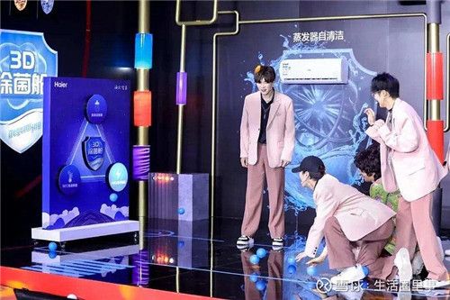 那么,如何在一场发布会快速贯通不同受众圈层?海尔智家根据旗下不同品牌调性,搭建了与之相匹配的场景展示,借助不同领域不同圈层的达人 ,触达各圈层受众。比如主打“健康”主题的海尔空调展区,模仿其核心科技3D除菌舱,搭建了一个舱体结构的科技风空间,通过新奇的互动游戏方式让用户在轻松娱乐中感知产品科技点。