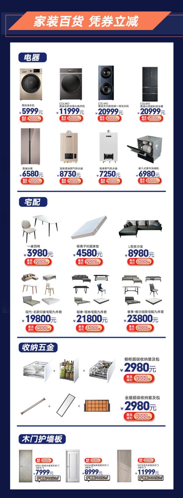 除了橱柜外,全屋套餐的优惠也是毫不相让。除了额度相同的集团补贴券,选购任意全屋套餐满足条件即送喜临门床垫、皮床等万元赠品。
