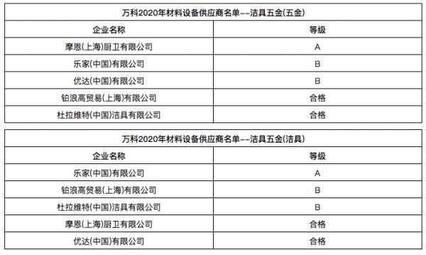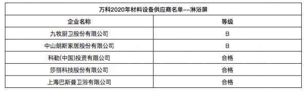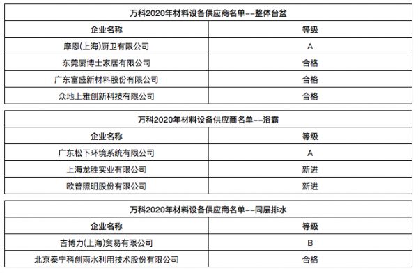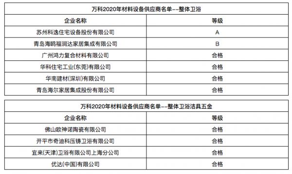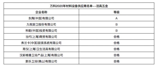 万科发布2020年合格供应商名录,近60家卫浴、橱柜企业入选
