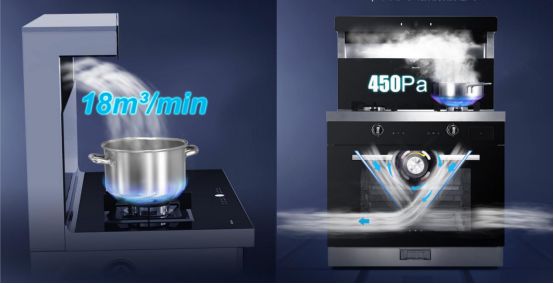 高吸油烟率、低油烟扩散率是集成灶的一大优点。海信厨卫集成灶吸风风量高达18³/min,最大风压高达450pa,配合八字排烟技术,不仅吸得净更加排得顺,而且采用低空劲吸,吸烟口离油烟源头更近,在油烟扩散前瞬吸瞬排。
