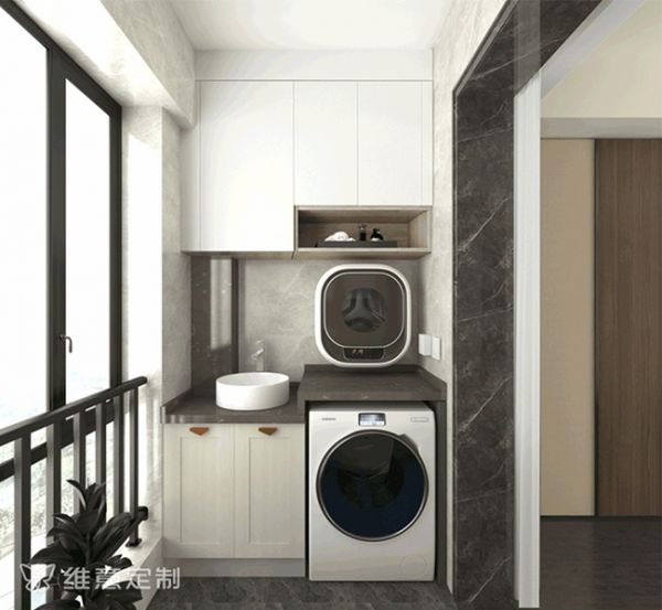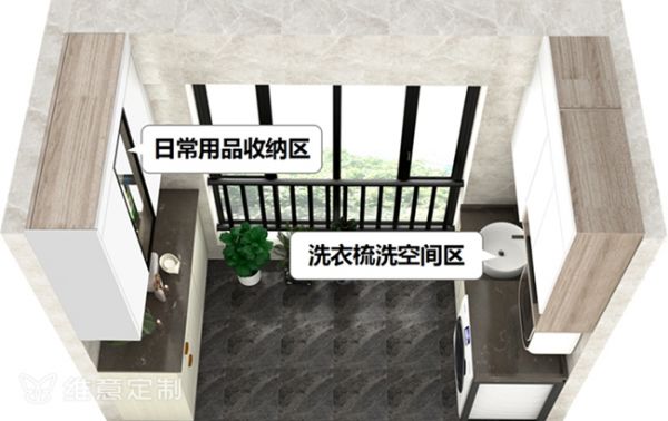明确地划分功能区,是为了更加合理地使用阳台,以满足绝大数家庭的日常使用。本空间左侧为日常用品收纳区域,定制壁柜,把杂物全部藏起来,保持阳台的开阔和整洁。右侧为洗衣梳洗空间区域,更方便日常清洁卫生、洗涤衣服。