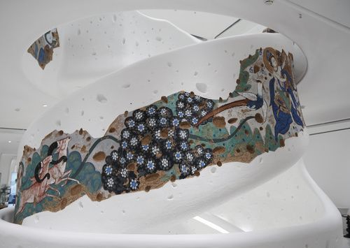 这份经典高尚的文化立意并未被束之高阁,而是以更平易近人的方式与每一位步入美克洞学馆的参与者发生互动。从负一层到三层,美克共设置了14个共享区打卡点,精彩绝伦的壁画、意想不到的装置、艺术氛围的雕塑,在不断变化的视觉体验中,展开一幅幅别有洞天的风情万种。龟兹洞天、石窟云梯、西域峡谷、楼兰墙、雅丹墙,这些别致的打卡点仅仅是名字,就让传统文化中的异域之情扑面而来,再现古丝绸之路的风貌。展列于公共空间内的25幅三角壁画,亦将佛祖和天人等形象带入人们眼前,好似时间穿梭。
