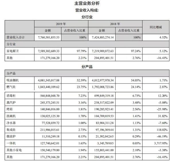 图表可看出,2018年度,在老板电器旗下的十余种厨电产品中,集成灶产品的营收比重超过了微波炉(0.29%)和净水器(1.13%),与洗碗机1.41%的营收占比极为接近。2019年度,集成灶业务的整体占比已经达到2.73%,超过了洗碗机和净水器的营收占比。可以预见,集成灶业务在2020及2021年营收占比会进一步提升,成为老板集团多品类战略的重要版图。