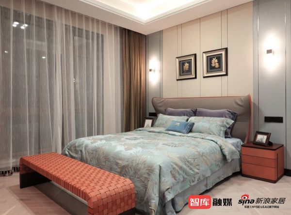 卧室背景墙使用了皮革硬包加木制作的一个搭配,背景墙的中间部分为虎皮纹理的皮革硬包,床头两侧为嵌入了金属饰条的淡蓝灰色木制墙板,将皮质、木质、金属三种材料很好的结合在一起,从而营造出现代与轻奢的感官效果。软装部分多处使用了橙色皮质家具,进一步提升整体空间的奢华质感。也使得卧室区别于以石材为主的公共空间,皮质的观感和触感能让主人在休息时能够得到更好地感受到放松和惬意。