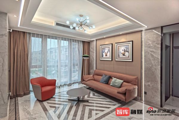 二层多功能厅地面采用了45度的斜向拼花,营造出一种瓷砖地毯的构成效果,而墙面的硬包与沙发窗帘则都选用了偏暖的颜色,柔软的质感搭配偏暖的色调也使得地板与吊顶中的直线条不会过于刻板。背景墙的颜色选择了与一楼客厅背景墙接近的同类色,但是材质上有所区别,使用的是皮革硬包。在统一之中又有一些细节的变化区分,看起来既整体又不单调。再搭配上皮质的沙发与岩板材质的茶几,使得整个空间看起来非常的时尚靓丽。