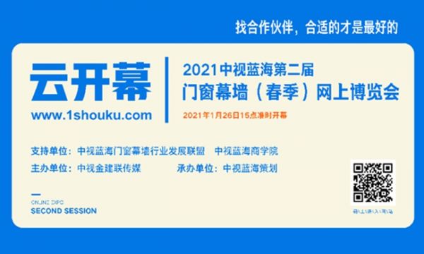 北京时间2021年1月26日,"2021第二届中视蓝海门窗幕墙(春季)网上博览会"在线上开幕。本届网上博览会是由中视蓝海门窗幕墙行业发展联盟支持,中视金建联传媒主办、北京中视蓝海企业策划有限公司协办、中视蓝海商学院承办。