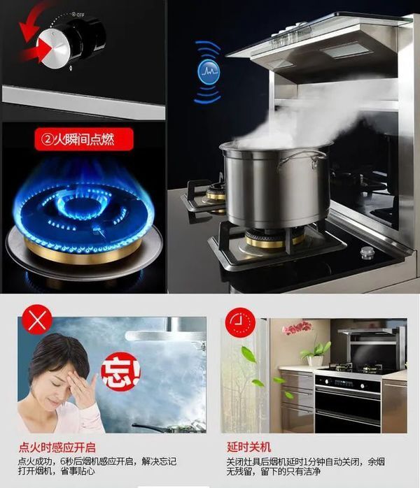 目前,市面上的智能化集成灶已实现智能烟灶联动功能,烟灶之间能感应开启,启动灶具点火旋钮,烟机就会立即自动感应同步开启,时刻准备净吸油烟;关闭灶具后,烟机自动延时1分钟再关闭,直至吸净油烟。