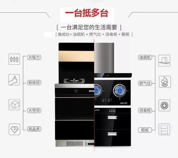而集成化的集成灶中,其烟机灶具、消毒柜、储藏柜以及蒸箱、烤箱、洗碗机甚至小冰箱等,都可以集成化,各部件实现集成配套后,可根据消费者的需求意愿,进行有效的组合,像组装电脑一样,匹配组合出最适合消费者意愿的集成灶产品,满足消费者对不同价位、不同功能、不同产品需求、与不同喜好特点的集成灶的需求。这想要厨房做好节省空间这一步,从牙缝大小的空间里再挤出一点来,而挑选合适的家电则是第一步,拒绝单一功能电器,买一机多用的,才正确。集成灶,集油烟机、燃气灶、消毒柜/蒸箱/烤箱/冰箱/洗碗机等等于一体,用1㎡的空间就搞定了以来需要占三个机器位置的厨房电器,其三大功能随便哪一个拿出来都可以和单一功能电器相媲美。