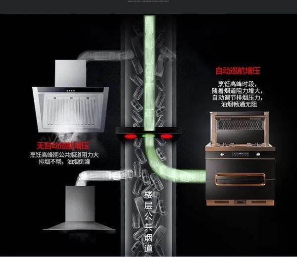智能化集成灶还有一个优势是,在公共烟道高峰期其自动巡航功能设置能实时监测公共烟道风压变化,自如应对做饭高峰期公共烟道油烟问题,排除油烟倒灌和串味风险。