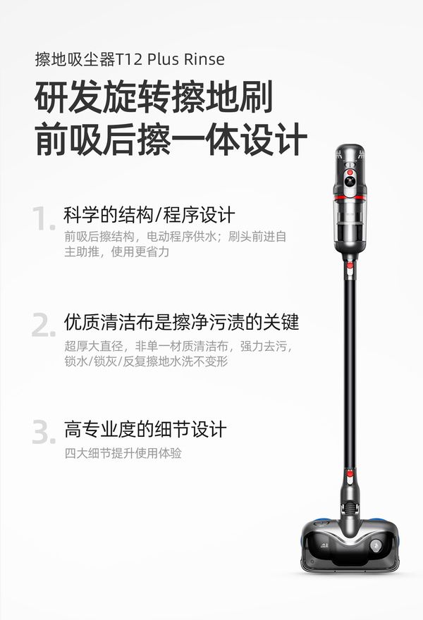 时下,吸拖一体吸尘器是非常热销的吸尘器品类产品,吸尘+拖地的组合让家庭清洁省事不少。但是,随着使用的深入,拖地水箱在地面清洁时静态跟随电动吸头、出水量无法调节等缺陷也暴露无遗。而T12 Plus Rinse擦地吸尘器的核心亮点就在于旋转擦地刷的配置,该款刷头拥有结构设计科学、细节设计专业的优势,能够为消费者带来更加洁净的地面清洁体验。