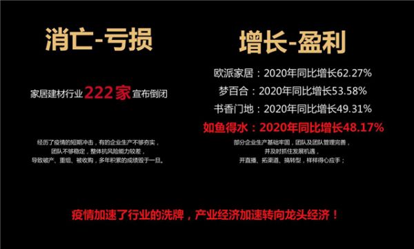 1. 纵观行业 消亡-亏损:大数据分析,2020年家居建材行业222家宣布倒闭,经历了疫情的短期冲击,有的企业生产不够夯实,团队不够稳定,整体抗风险能力较差,导致破产、重组、被收购,多年积累的成绩毁于一旦。