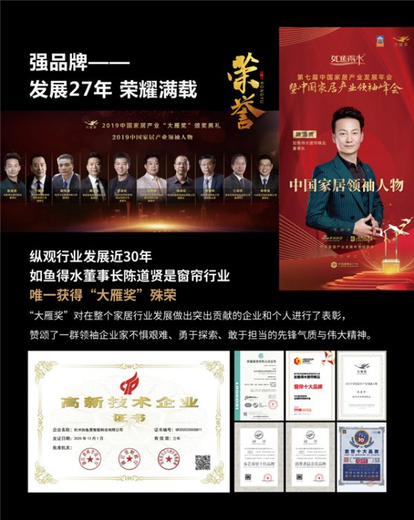 实力背后是荣誉,如鱼得水是全国“窗帘十大品牌”、“消费者最喜爱品牌”、“大雁奖”领袖人物、2019年和2020年连续两年获得世界墙纸墙布大会“最具影响力品牌奖“和”年度最具价值品牌奖“,更是窗帘行业内唯一的“高新技术企业”。