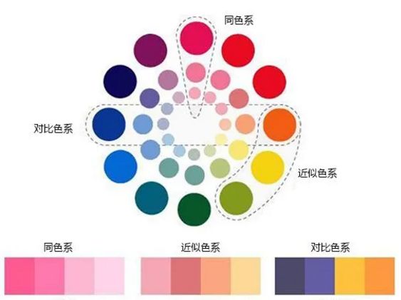 同类色,即相近色。比如墨绿和浅绿、藏蓝和天蓝、具有相同视感的红与橙等。