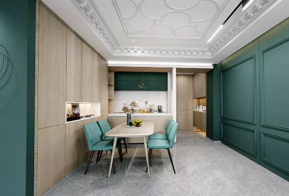 硬装以复古绿为主,石膏雕花线条装饰墨绿的墙面,搭配灰绿的餐椅。