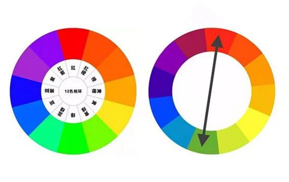 色相环里任何直径两端的相对之色就是互补色,比如红色和绿色,蓝色和黄色。