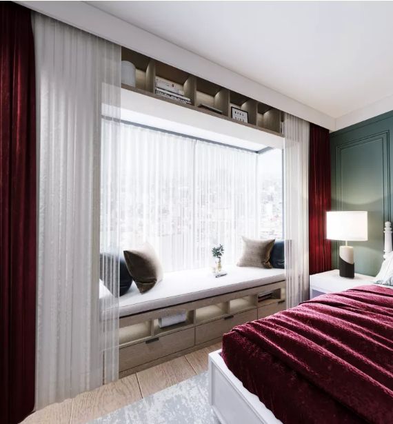家居软装上红绿映衬,墨绿色墙面搭配酒红色丝绒窗帘以及酒红色床品,形成差异化补色,饱满却不刺眼。