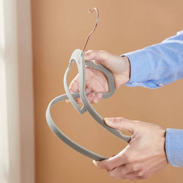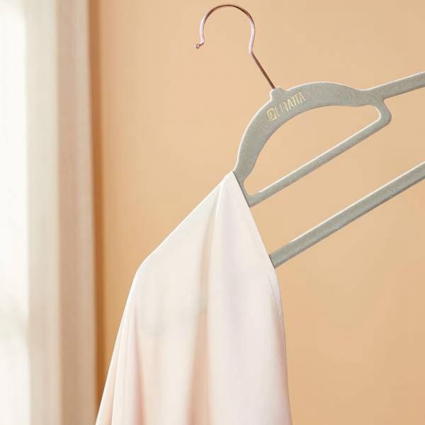 衣架所有表面都植上了一层细细的绒毛,摸起来就像羽绒一样柔软,不仅能够防止真丝衣物滑落,还能呵护衣服避免钩划出印痕……