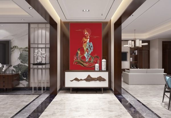 自古朱雀就为四大神兽之一亦为祥瑞之兆。水为财,寓意财源滚滚。石为时,寓意时来运转,事业稳健。朱雀若为山形,应端庄耸拔且活泼秀丽,向山含情朝拜而为歌舞。朱雀如是水形,水是地中生气之形应,故亦当屈曲回旋,如百官之朝君王。在风水学,朱雀亦指房间的前方,此作品铺贴房间的玄关是非常合适的选择。