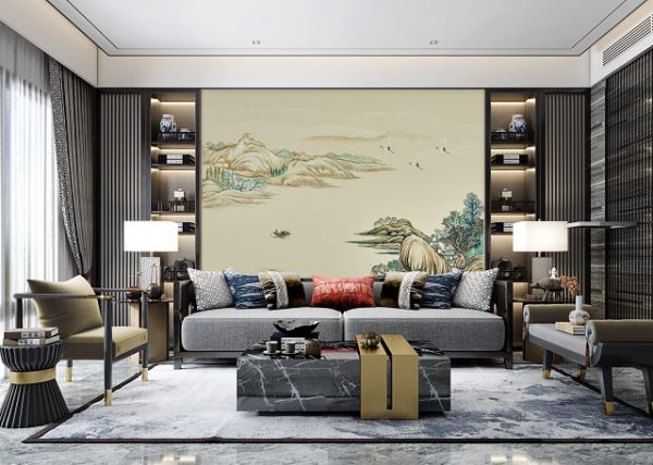 唐朝杜甫《清明二首》:“秦城数阁烟花里,汉主山河锦绣中。”“山水聚福”图案花型设计来源与故乡的锦绣河山。完美的用布艺刺绣的工艺去表现,色彩鲜艳,质地精美。中国房屋建筑或居家装修十分讲究背靠山水。这款产品中的山水图案适合铺贴在客厅背景、书房、卧室床头背景、座椅背后墙面。背靠山水、寓意事业有成、财源广进、家庭稳固。