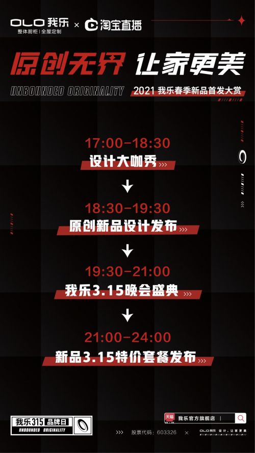 3月6日19点,我乐天猫直播间,翘首期盼的“原创无界,让家更美”我乐315品牌日大赏将激情上映。这场由我乐家居独家打造的超震撼视觉盛宴,不仅是一场原创春季首发新品秀,也是大咖云集的视听盛会。到底现场将有哪些亮点和爆点?小编带你提前剧透!
