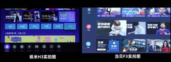 处理器方面当贝F3采用了Mstar938处理器,对比老一代的Mstar848处理器性能提升不止一倍,毫无疑问当贝F3的运算能力和性能绝对是超出极米H3一倍有余。再加上当贝F3拥有4+64GB的存储,对比极米H3DE 3+16GB,能让运算能力得到最大解放,更别说4倍的ROM容量是目前投影仪市场上及其罕见的配置了。