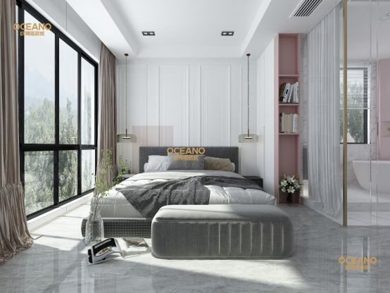 入夜,一轮明月高挂星空,月光与星光跳过落地窗落入卧室,调皮地撩拨你,放眼望去,满城风景,当然这个设计放在小空间中,便只剩满墙风景了。