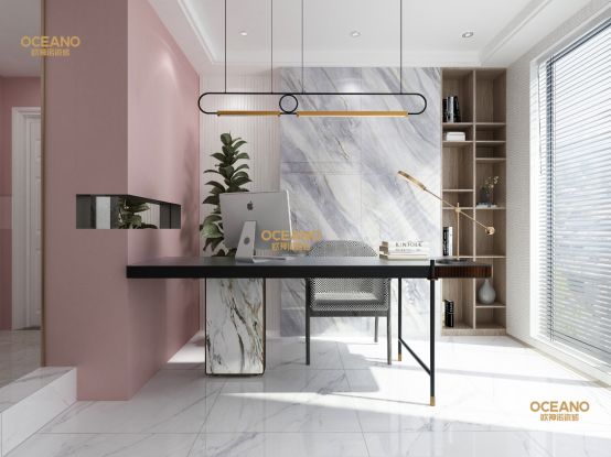 书房的设计带着粉色的延伸,一墙之隔,两个世界。与其他空间不同的是,书房的设计更为严肃,却又因一墙之粉打破了他的严谨,又以空间的融合,完美地恰合在一起。