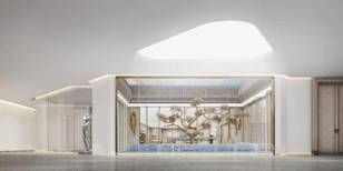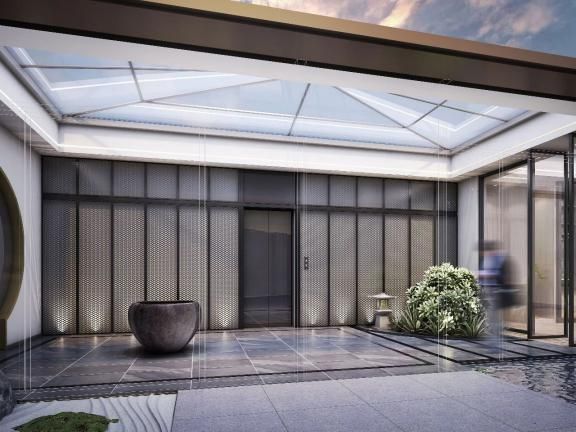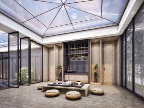 推门而入,幽雅的灰色调与水墨意象穿映于其中,顶部一隅的玻璃天窗,可以更好地引进自然光线。