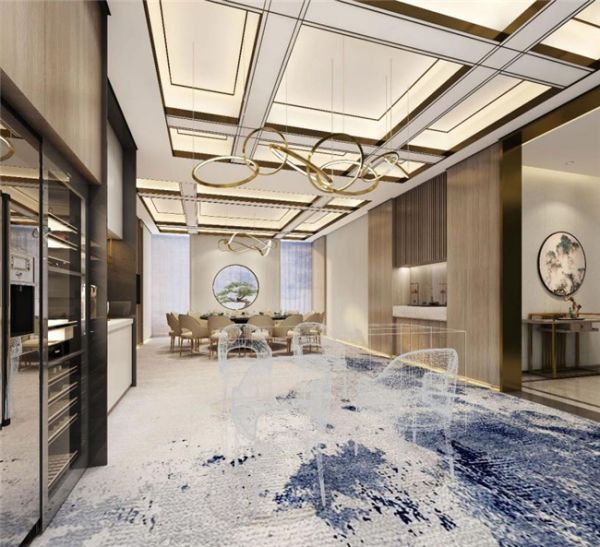 涟漪、岛石、风荷、夏莲、等不同元素在空间中悄然衬托,空间给人的观感似是在泛舟听湖。