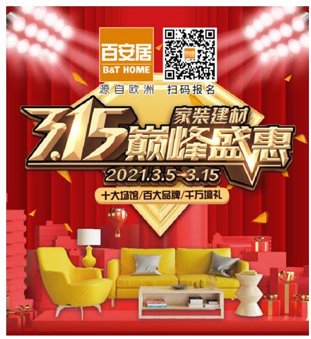 对此,国内家装家居领军企业百安居于3月5日至3月15日重磅推出“家装建材3.15巅峰盛会”,联合百大品牌,以十大场馆的形式发起活动,回馈消费者,为消费者带来千万壕礼和一场前所未有的狂欢盛宴。
