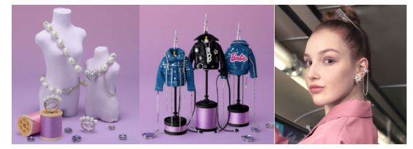 芭比爱心项链(左)、芭比衣橱耳环(中)、芭比爱心耳夹(右)