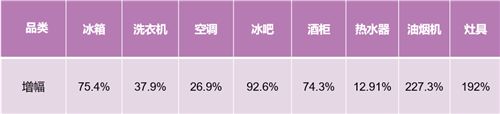 这一趋势在市场中有明显表现。就拿高端家电品牌卡萨帝来说,累计至9周的中怡康数据显示,冰箱、洗衣机在TOP3品牌中增幅第一。其中冰箱零售额同比增幅75.4%,洗衣机增幅37.9%。此外,冰吧和酒柜增幅92.6%、74.3%,空调增幅26.9%,热水器增幅12.91%,油烟机和灶具增幅分别为227.3%、192%。