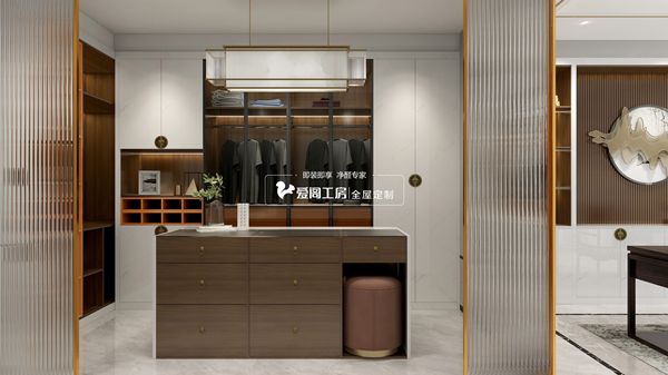 主卧、次卧与衣帽间延续整体的中式轻奢风格,卧室是休息的地方,是一个私密空间,这里是最能体现主人特质的地方。卧室以素净的雪花白为主色调,搭配中式花样和部分深色木色家具,让整个休息区域充满舒适、淡雅的气质。简约的卧室装修和时尚的衣帽间放大了空间感,让主人在这个私密区域获得自由的生活体验。